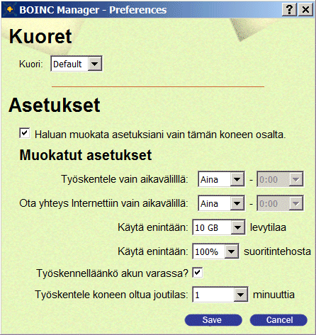 BOINC Manager -ikkunan Preferences -valinnasta: